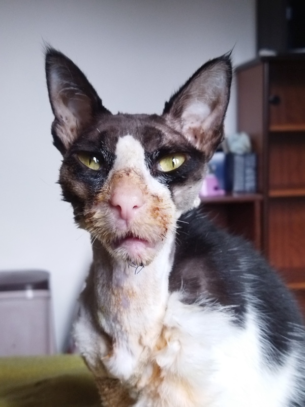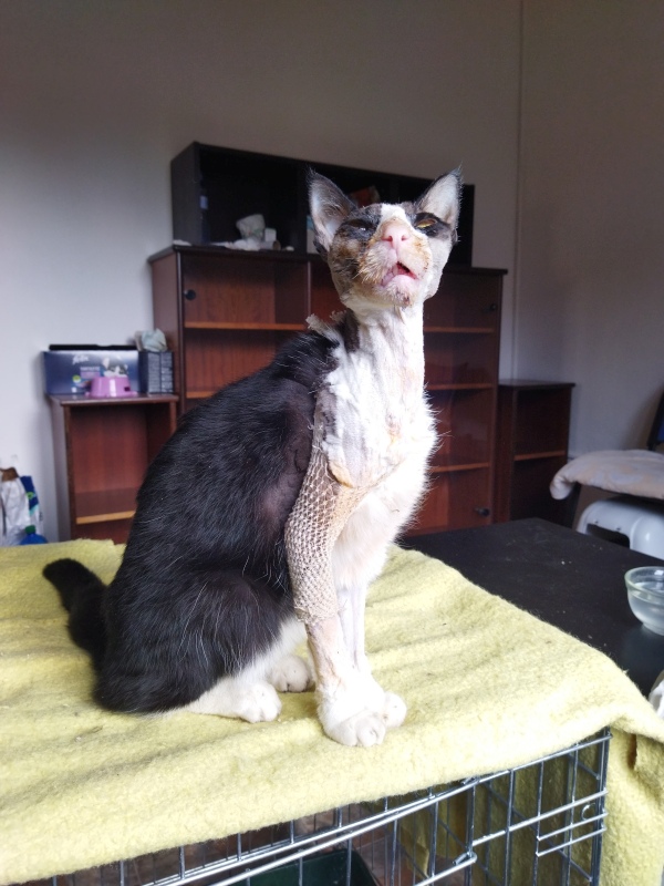 Zraněný kocourek ze Všenor. Říkáme mu Supík. Supík má zraněnou nožičku a tlamičku. Na veterině mu srovnali a sešili tlamičku i nožičku. Je milý, čilý, jak mu to jeho zranění dovolí.