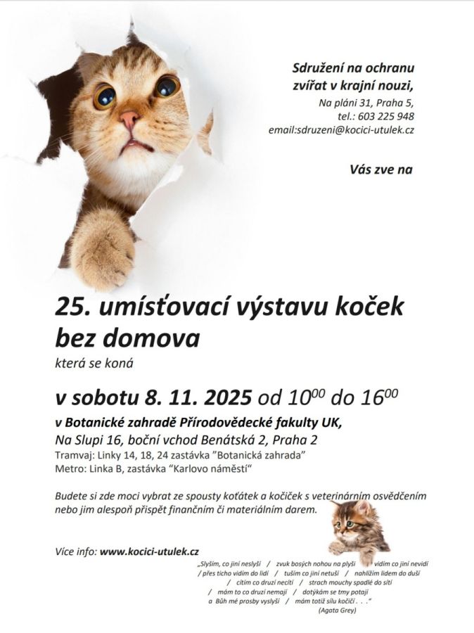 8. listopadu 2025 - Zveme srdečně všechny zájemce o kočičku i naše příznivce a podporovatele - naše tradiční umisťovací výstava koček bez domova už 25. v Botanické zahradě Přírodovědecké fakulty UK. Zůčastní se opět několik kočičích útulků, nabízet budeme koťátka a dospělé kočky s veterinárním osvědčením. Vítáme i návštěvníky, kteří přijdou, aby podpořili útulky v jejich péči o bezprizorné kočky.